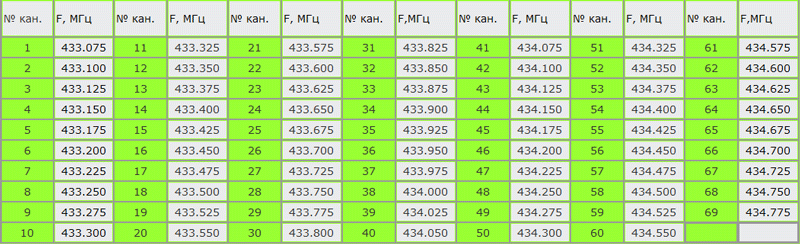 2. Лезем в табличку и смотрим, какой частоте соответствует выбранный канал мидланда. табличка прилагается